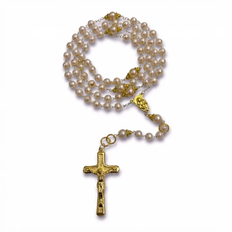 This Cream Pearl and Gold-Tone Catholic Rosary is more than an accessory. It is a call to prayer. It is a reminder of the beautiful, intertwining nature of joy and sorrow in the life of Christ, mirrored in the cream and gold of the design.