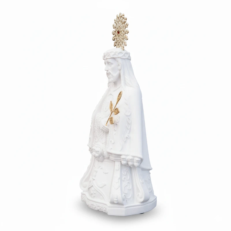 • The Royal Cape: Even in this simplified white form, the statue is sculpted with the heavy, ornate cape that signifies His royal and priestly dignity. The clasp at His chest, the rope that binds His hands, and the detailed trim on the vestments all point to the original, venerated image.