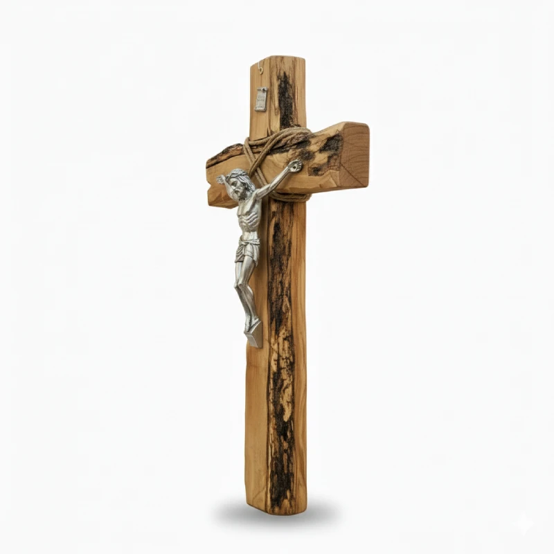 Run your fingers along that bark edge. You can feel the ridges and valleys, the history of the tree, its life under the Mediterranean sun. No two crucifixes are ever identical. The grain pattern, the knots, and the exact contours of the bark are unique to your specific piece, as individual as a fingerprint.