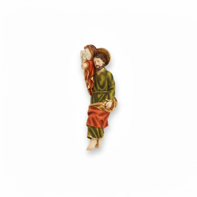 Rich Symbolism in Color and Form: The statue is painted by hand in rich, traditional colors. Joseph’s outer garment is often depicted in earthy greens and browns, symbolizing his humility, his connection to his work as a carpenter, and his role as a grounded, stable protector. His inner tunic is a warm, deep red or orange, a color often associated with love, sacrifice, and humanity. These are not merely decorative choices; they are a visual language that tells the story of his character. The gentle folds of his robes are carefully sculpted, giving the figure a sense of weight and realism. A golden halo, delicately painted, signifies his sainthood without disturbing the humble humanity of the scene.