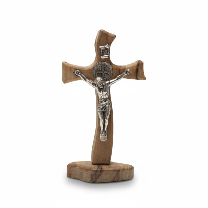 The crucifix has long stood as the ultimate emblem of the Catholic faith. It is a powerful, ever-present reminder of Christ’s sacrifice, the boundless depth of His love, and the promise of redemption that lies at the core of our beliefs. While every crucifix tells this central story, some pieces, through their unique materials and sacred additions, offer an even deeper layer of spiritual significance. This is profoundly true of our Curved Olive Wood Standing Crucifix with St. Benedict Medal.